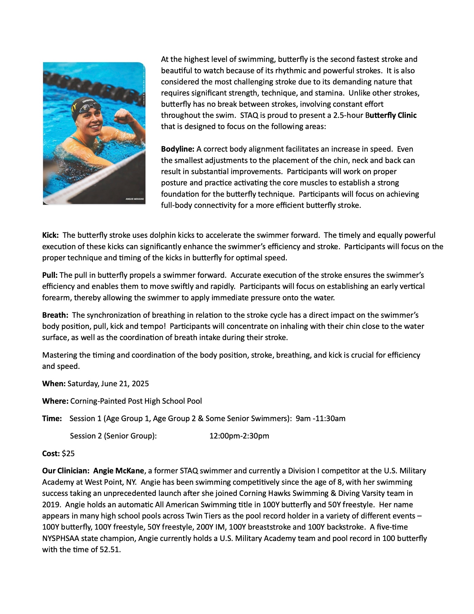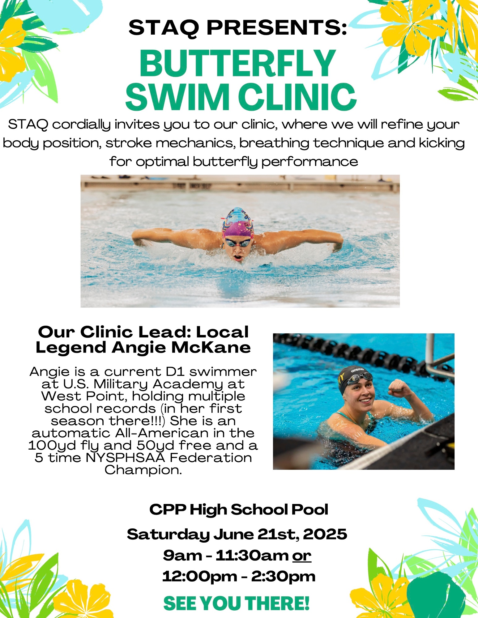 We are happy to announce that STAQ has secured a new date for the Butterfly Clinic! We will be offering two separate swimming sessions designed to accommodate individual skill levels: